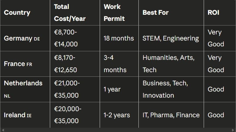 • Best Post-Study Work Options: Germany (18 months) and Ireland (1-2 years)